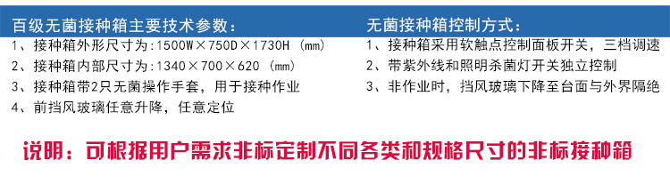 無菌接種箱為百級環境,內部帶有紫外線殺菌燈,在將接種種苗或菌包放入接箱內后,內部進行密閉殺菌,在接種過程中全程密閉,人員通過無菌手套箱進行操作,手套箱為無菌室專用,有極強的耐酸耐堿性。百級無菌接箱可極大的提高接種的成活率,效率達到99%以上。