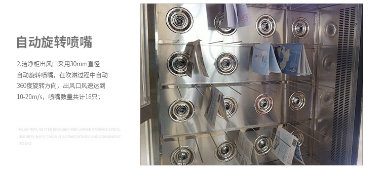 2. 潔凈柜出風口采用30mm直徑自動旋轉噴嘴,在吹淋過程中自動360度旋轉方向,出風口風速達到10-20m/s,噴嘴數量共計16只;